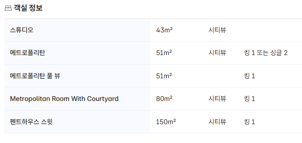 - 4층 객실: 시티 룸, 메트로폴리탄, 테라스