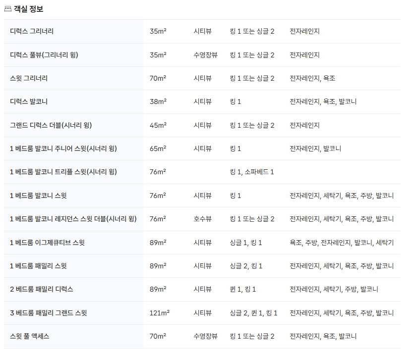 시너리 윙(구관) : 디럭스 발코니, 1베드룸 발코니 스윗, 1베드룸 이그제큐티브 스윗, 1베드룸 패밀리 스윗, 2베드룸 패밀리 디럭스, 3베드룸 패밀리 그랜드 스윗