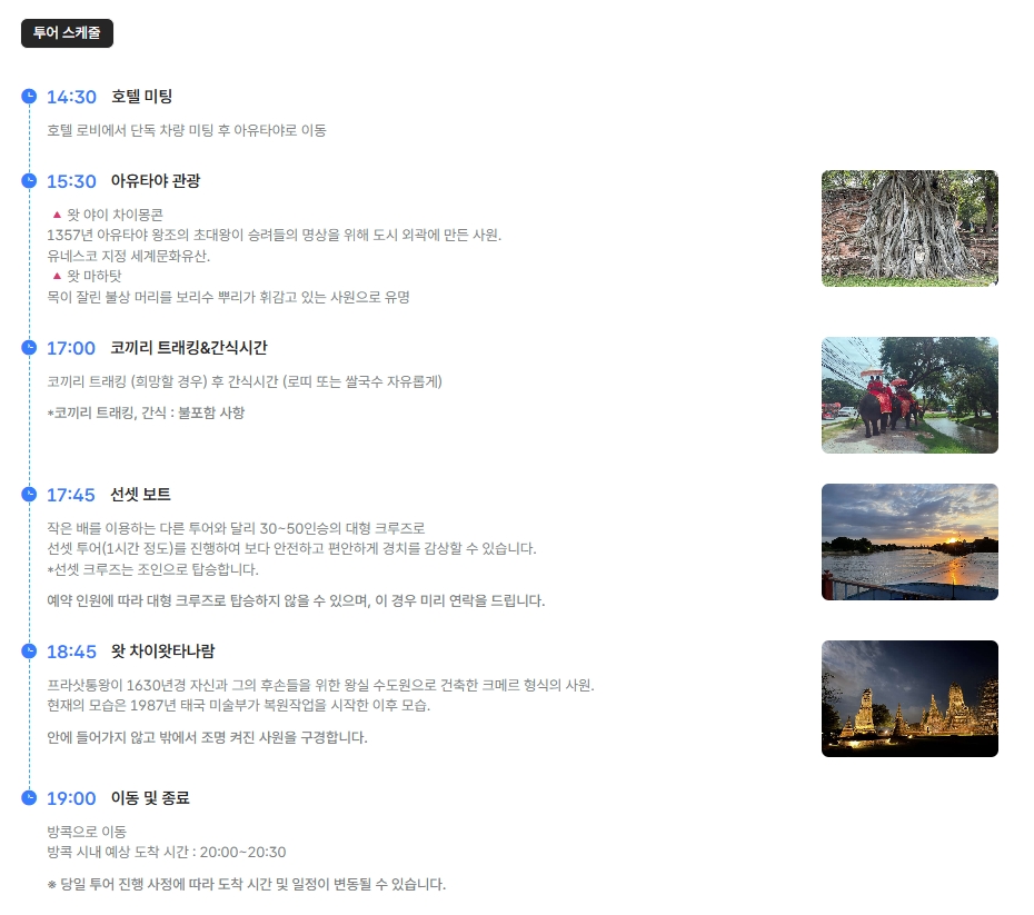 기본적으로 투어 내용이 왓 야이차이야몽콘, 왓 마하탓을 구경 후 아유타야 시내 중심지에서 코끼리 트래킹을 체험할 수 있는 시간도 갖게 됩니다.
