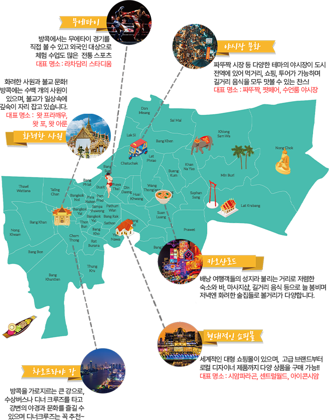 차오프라야 강 위에서 방콕 왕궁의 야경을 감상하며 저녁 식사를 즐기는 로맨틱한 크루즈로 추억에 남을만한 시간을 가질수 있습니다. 현지 음악과 함께하는 선상 공연은 여행을 한층 더 특별하게 만들어줍니다.
